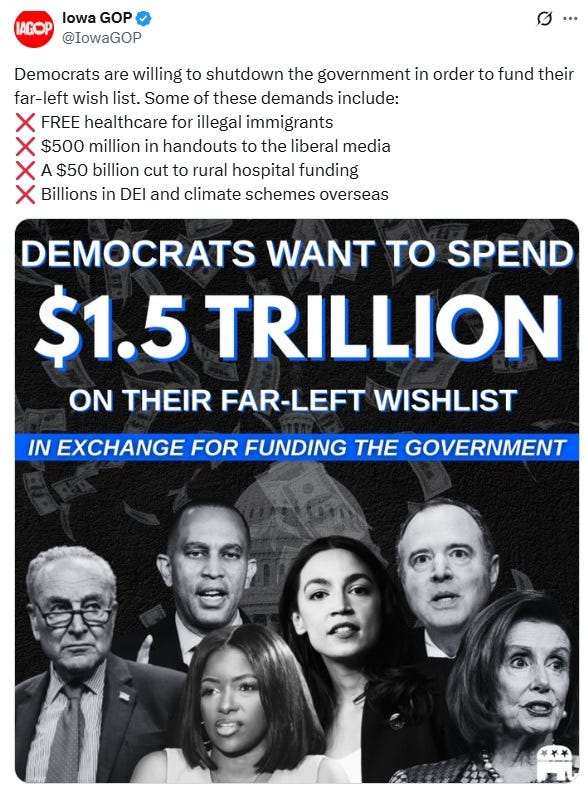 Some of the same Democrats refused to agree to any sort of short-term reconciliation (CR) to keep the federal government open unless it included their extortion demands. One of them was funding free healthcare for illegal aliens. Something like a trillion of their 1.5 trillion in demands. Your money to pay for health care for those in the country illegally, or else.
